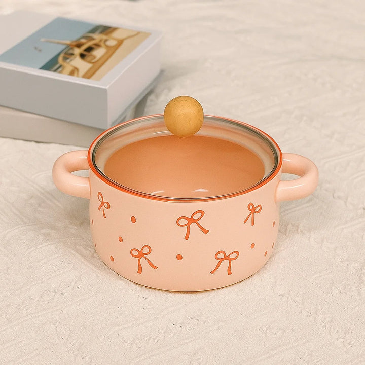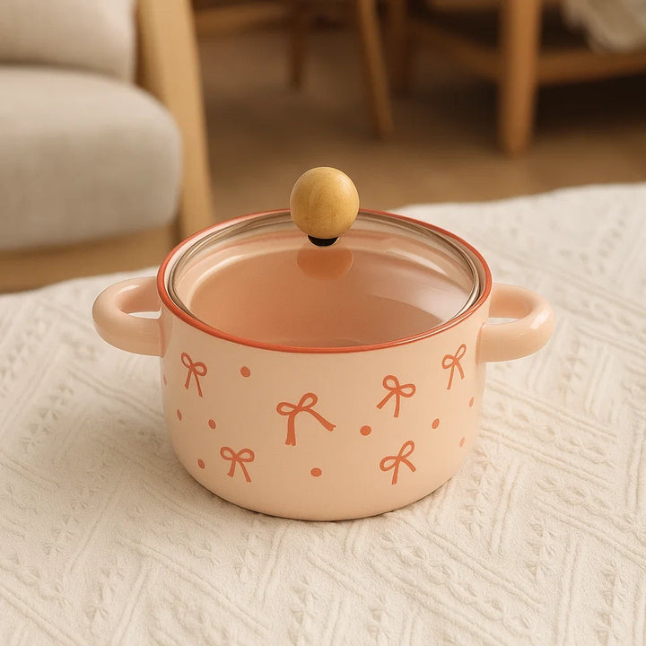 This adorable 8.5-inch ceramic pot blends charming design with everyday utility. Featuring delicate bow motifs on a soft pink background and a wooden knob lid, it's perfect for serving soups, curries, or noodles straight from the stove to the table. The twin handles make it easy to carry, while the lid keeps your meals warm and inviting.