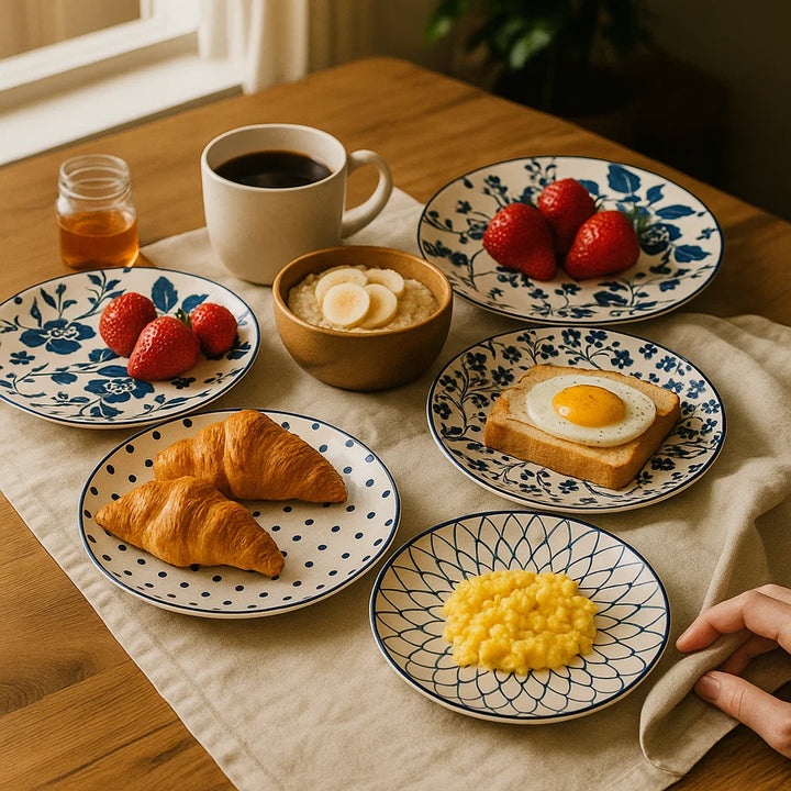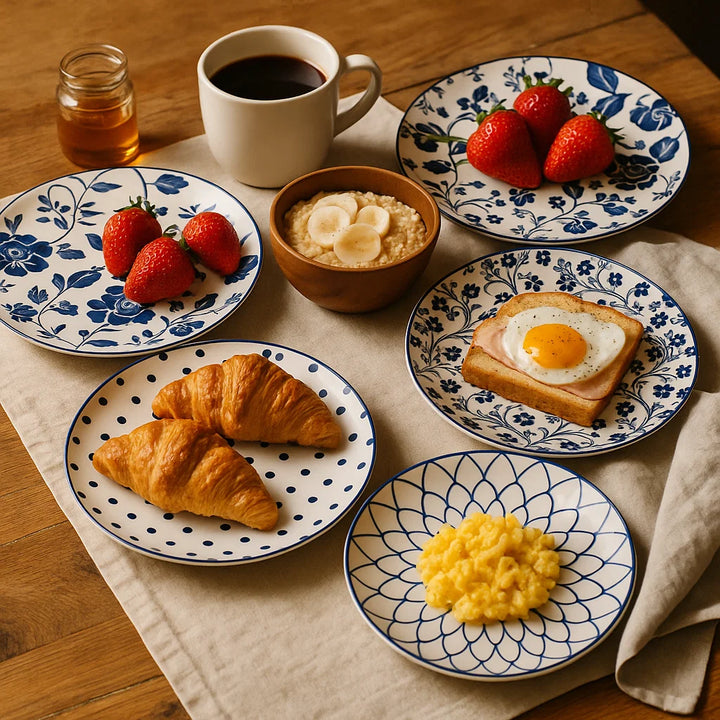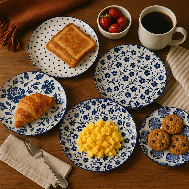 Tags: 7 inch patterned plates, blue and white ceramic plate, blue serving plate, ceramic side plate, dot pattern plate, floral ceramic plate, geometric ceramic plate, IN-Stock, Japanese-style plate, NEW, NEW ARRIVALS, small dinner plate