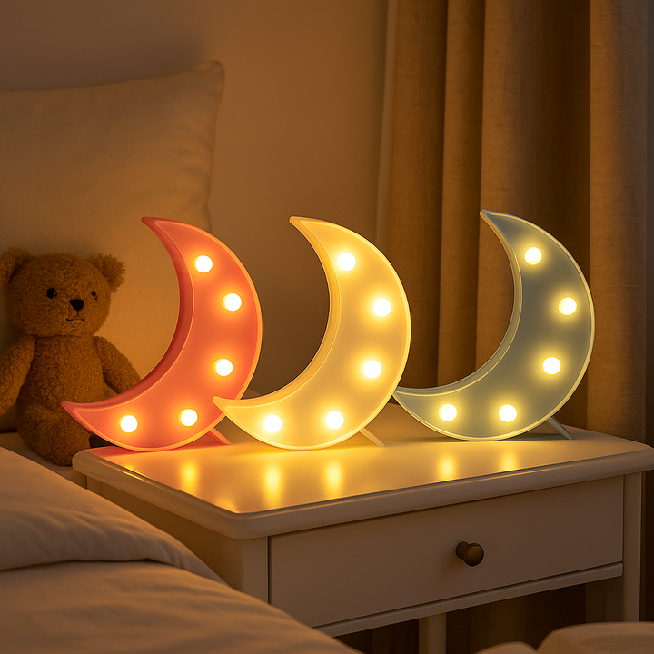Light up your space with a dreamy glow using our Crescent Moon Night Lamp – a whimsical and modern addition to any bedroom, nursery, or cozy nook. Available in three charming colors, this freestanding plastic lamp adds a soft ambient glow with warm LED lights embedded across its curved silhouette.