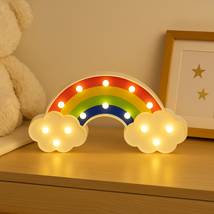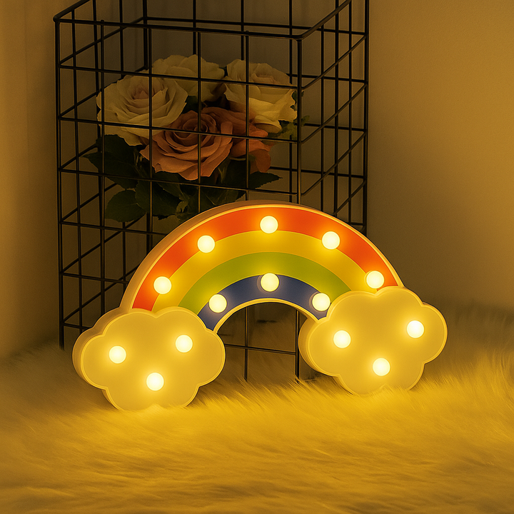Add a cheerful pop of color to your space with this rainbow-shaped LED light. With its vibrant arch and soft glowing bulbs embedded in cloud ends, this decorative piece is ideal for kids’ rooms, nurseries, parties, or any cozy corner. Battery operated and lightweight, it stands on its own—no messy cords or installations needed.