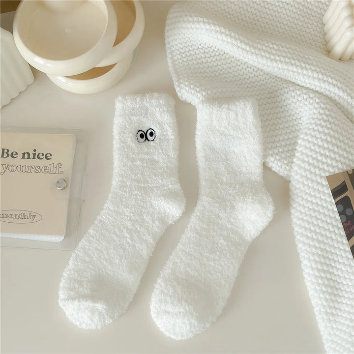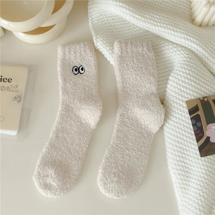 Wrap your feet in playful warmth with these adorable fuzzy socks, featuring a fun cartoon eye design. Made from ultra-soft plush fabric, these ankle-length socks are perfect for keeping your feet toasty during chilly days. The texture feels like a hug for your feet, while the embroidered eye design adds a whimsical charm. Available in multiple shades including black, brown, beige, off-white, and cream—each pair is sold separately so you can mix, match, or gift as you like.