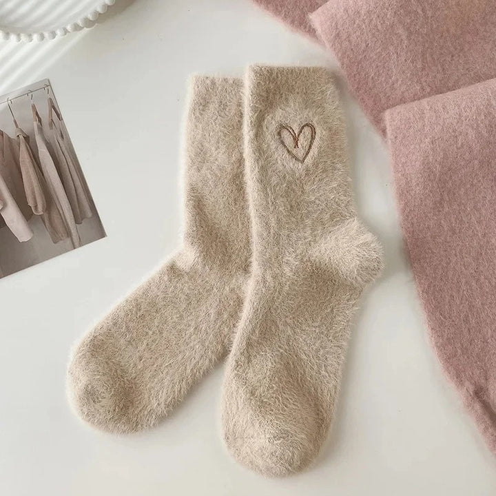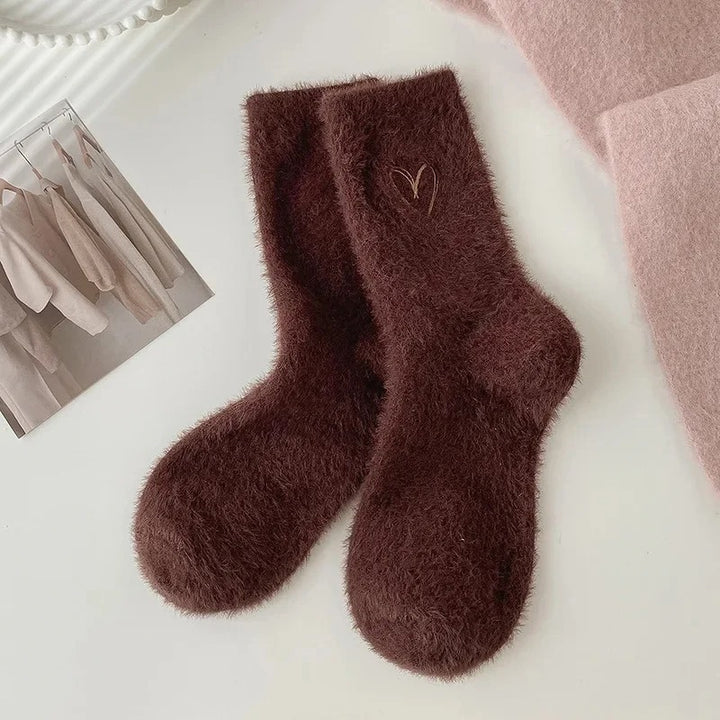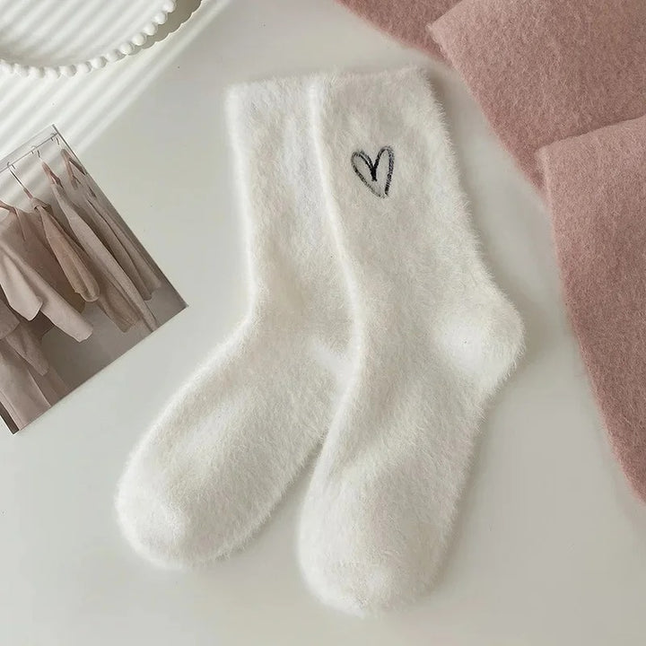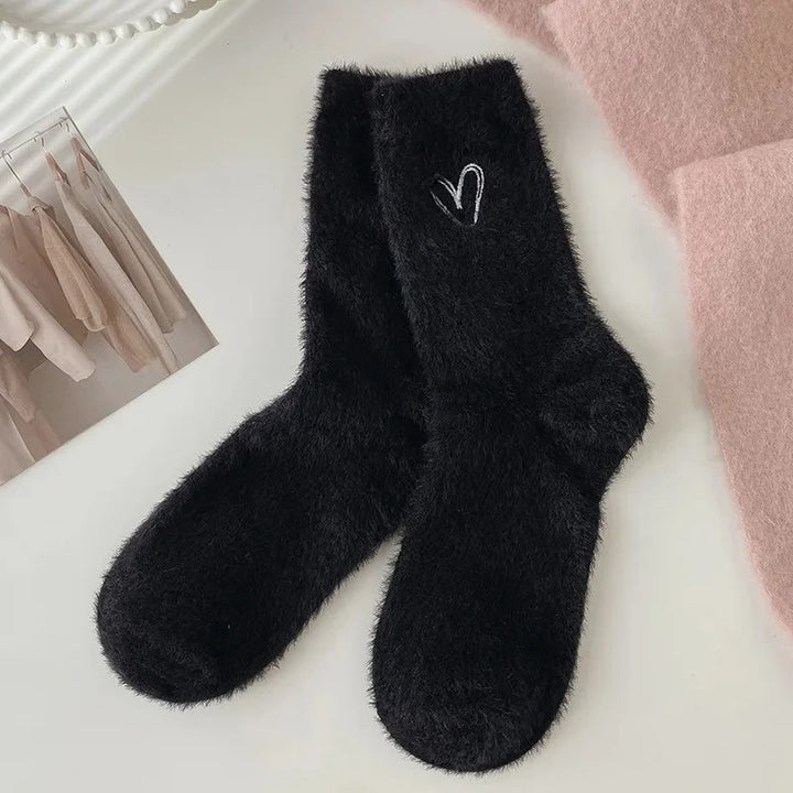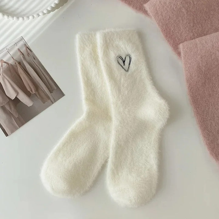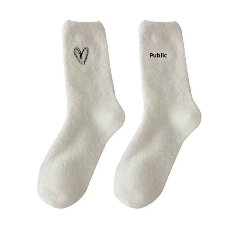 Step into understated elegance with these ultra-soft fuzzy socks, designed for warmth and charm. Featuring a delicate stitched heart-line motif on the ankle, each pair adds a subtle touch of personality to your winter wardrobe. The brushed texture and high pile fabric create a cloud-like feel, perfect for lounging, gifting, or pairing with cozy loungewear. Available in neutral shades like beige, ivory, brown, and black, these socks blend effortlessly into any aesthetic while keeping your feet toasty all season.