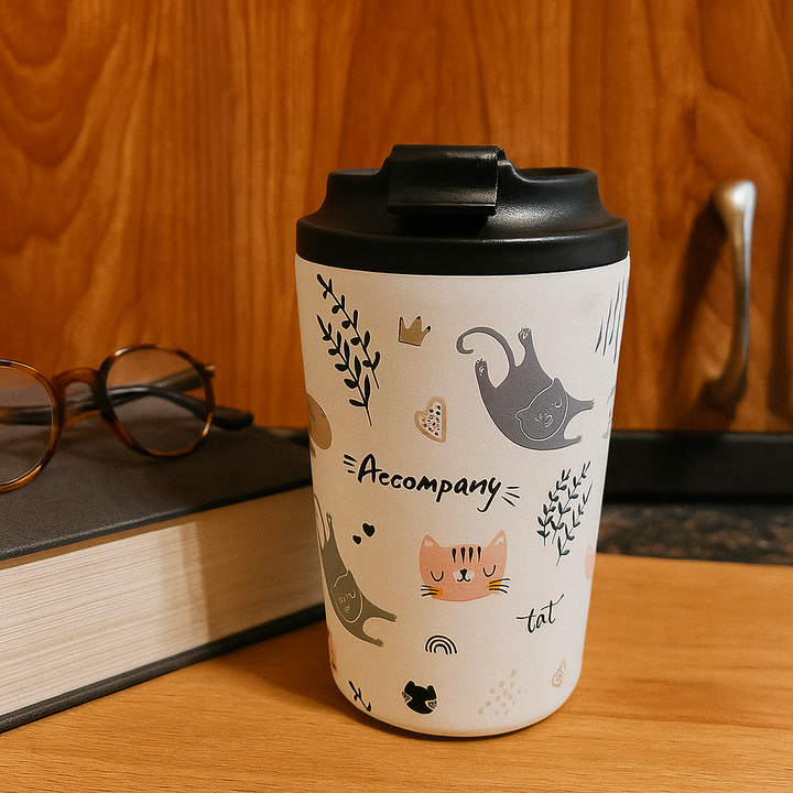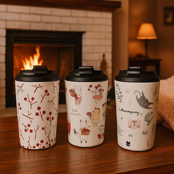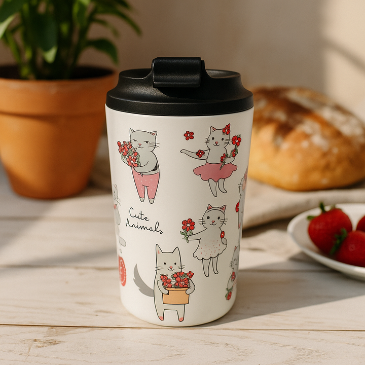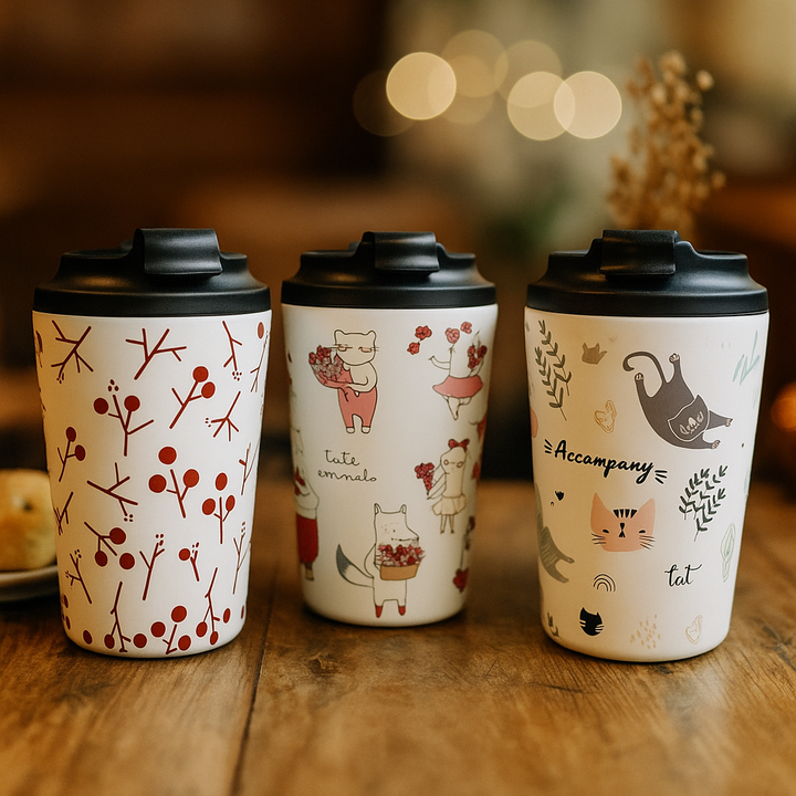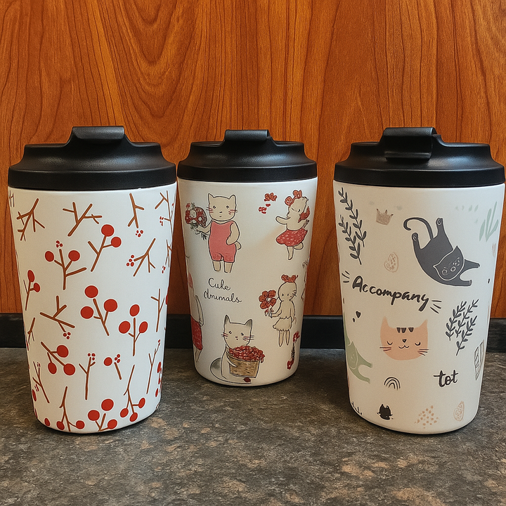 Take your coffee on the go with a touch of charm. Our 350ml travel tumblers feature delightful animal-themed illustrations printed on a smooth matte finish, perfect for brightening your daily routine.